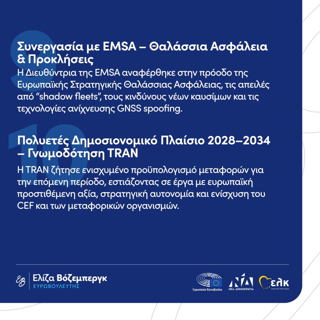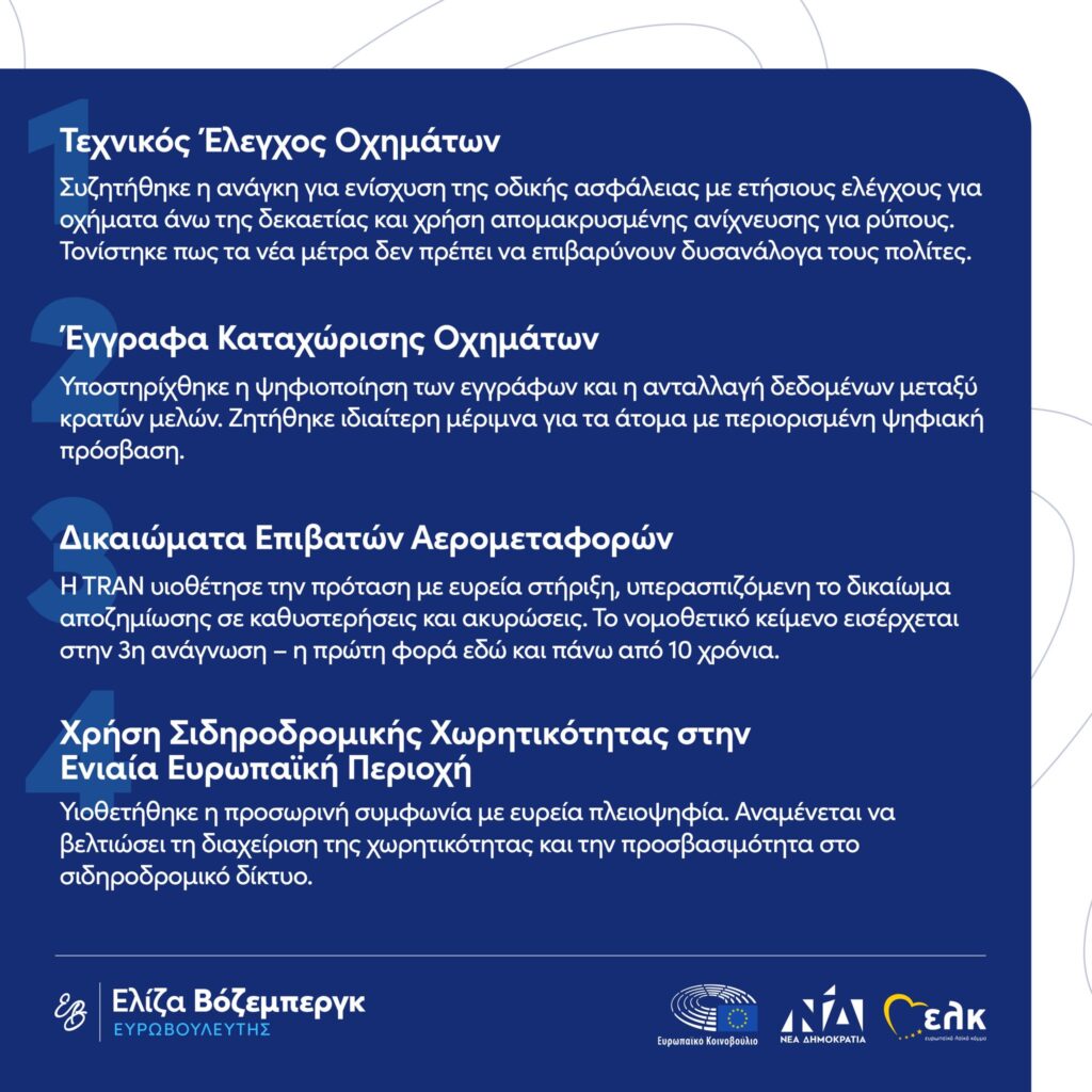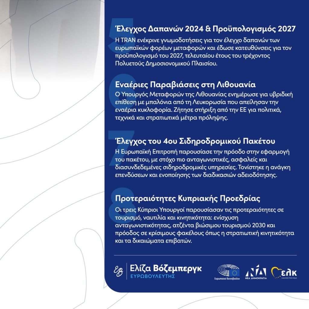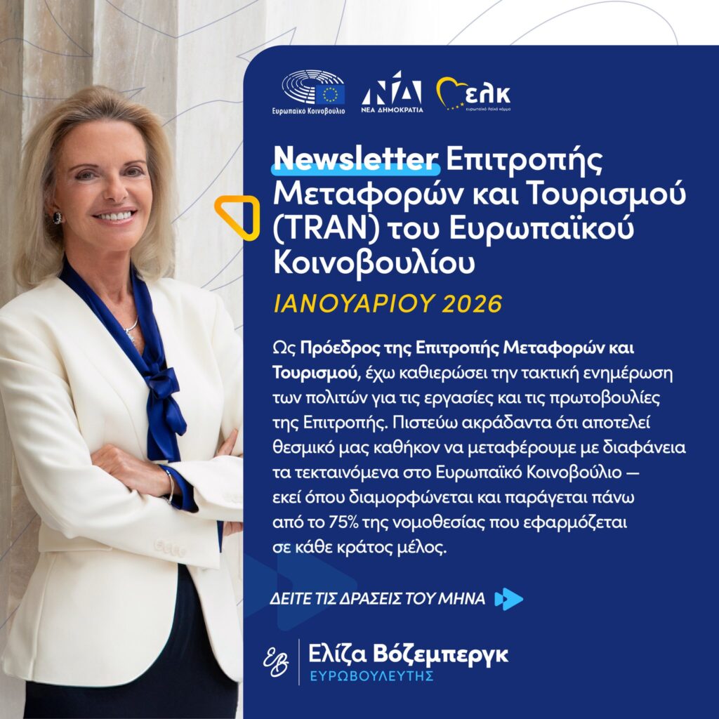 NEWSLETTER TRAN ΙΑΝΟΥΑΡΙΟΣ 2026 Fri 06 Feb | 01:28 in Δελτία Τύπου by elena 0 Likes Share Ως Πρόεδρος της Επιτροπής Μεταφορών και Τουρισμού TRAN του Ευρωπαϊκού Κοινοβουλίου, συνεχίζω την τακτική ενημέρωση των πολιτών για τις πολιτικές που καθορίζουν το παρόν και το μέλλον του τομέα των μεταφορών στην ΕΕ.