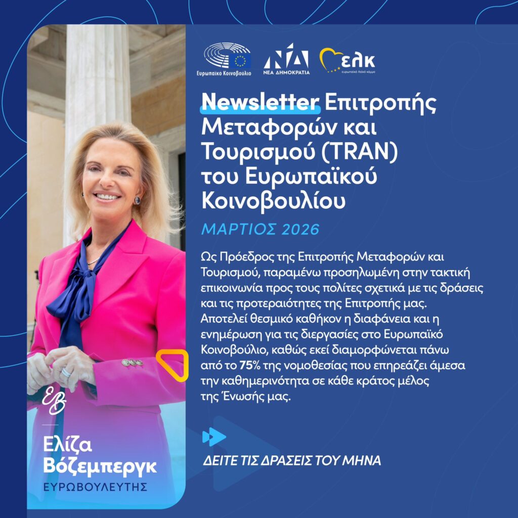 Newsletter TRAN Μαρτίου Tue 31 Mar | 12:35 in Δελτία Τύπου by elena 0 Likes Share Ως Πρόεδρος της Επιτροπής Μεταφορών και Τουρισμού TRAN του Ευρωπαϊκού Κοινοβουλίου, συνεχίζω την τακτική ενημέρωση των πολιτών για τις πολιτικές που καθορίζουν το παρόν και το μέλλον του τομέα των μεταφορών στην ΕΕ.